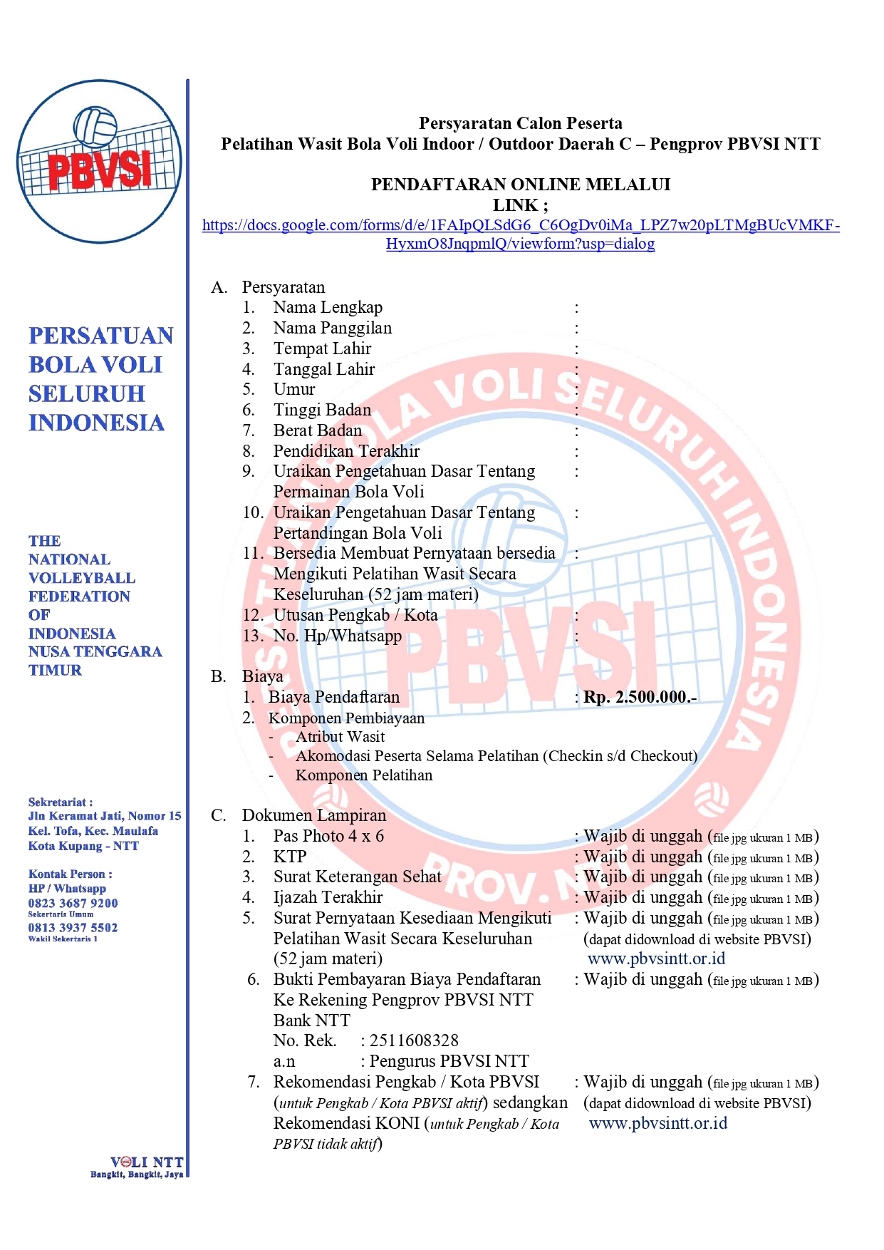 Ini informasi selengkapnya tentang persyaratan Persyaratan Calon Peserta Pelatihan Wasit Bola Voli Indoor / Outdoor Daerah C – Pengprov PBVSI NTT 2025